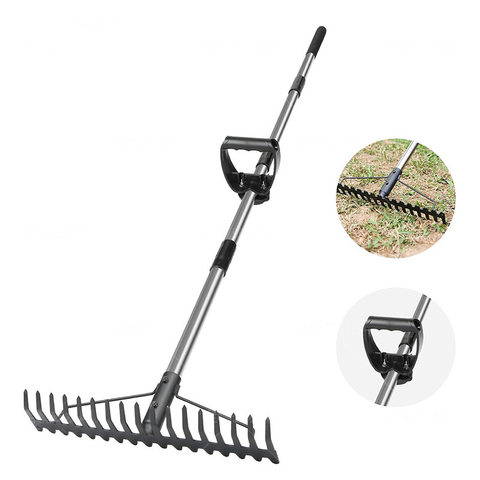 Rastrillo de arco multifuncional, cabeza de acero inoxidable, 17 dientes, Asa de bolsa ergonómica para aflojar el suelo, rastrillo de paja desmontable
